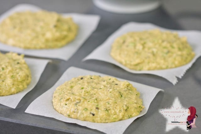 Voor de Airfryer heb ik stukjes bakpapier gebruikt waar ik 2 volle eetlepels van het mengsel op deed. Een beetje vormen tot een burger met je lepel en klaar. Er passen 3 kikkererwtenburgers in de Airfryer, als je de bakpapiertjes iets kleiner knipt dan ik deed passen er ook wel 4 tegelijk in.
