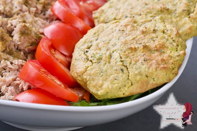 Het recept is genoeg voor 8 of 9 kikkererwtenburgers van 7 cm doorsnede en ongeveer een centimeter dik. Natuurlijk kun je er een broodje burger mee maken. Zelf vind ik de kikkererwtenburgers erg lekker als snack en smaken ze heerlijk bij een salade. Op de foto’s zie je er een simpele tonijnsalade bij.