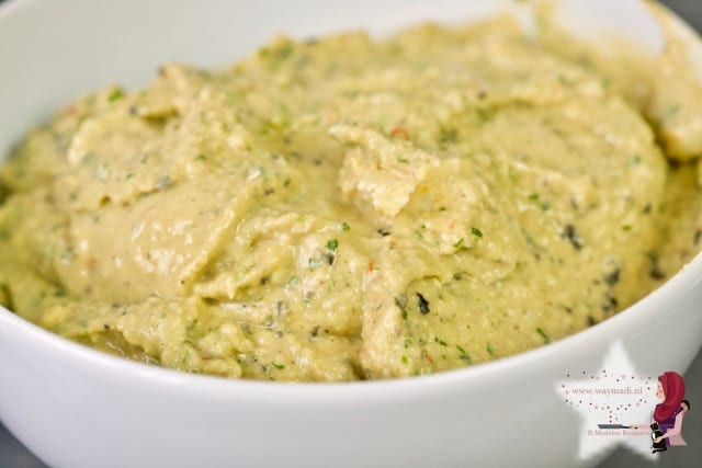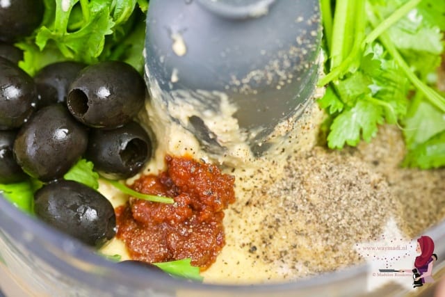 Je doet alle ingrediënten in de keukenmachine en laat deze draaien tot je de consistentie goed vindt.