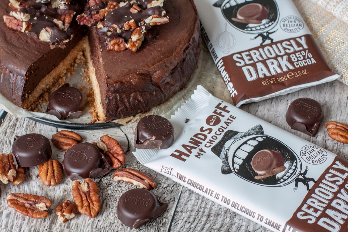 - Terwijl de cheesecake in de oven staat maak je de pecan crunch. Smelt de Hands Off chocolade. Hak de pecannoten in stukjes en leg ze op een stuk bakpapier. Schenk de gesmolten chocola voorzichtig over de stukjes pecan. Als je de pecan crunch even in de koelkast zet is de chocolade zo weer gestold. Ook heel lekker om zo los te eten maar in dit recept gebruik ik het als topping voor de cheesecake.