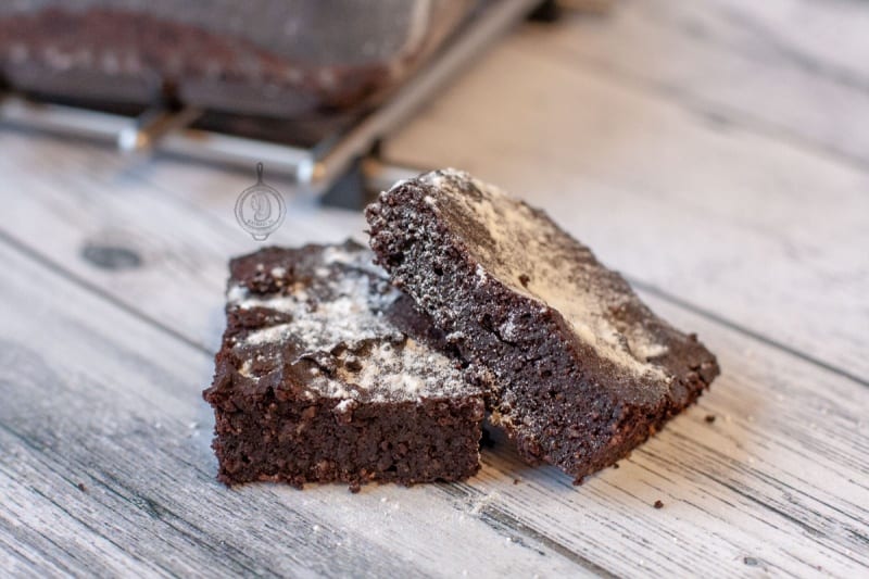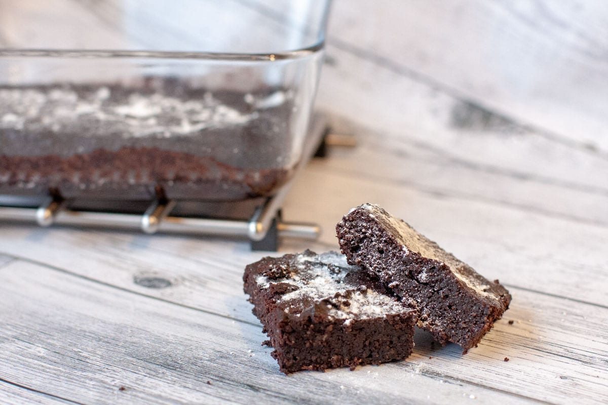 - Laat afkoelen op een afkoelrek en strooi daarna nog wat ‘poedersuiker’ bovenop je keto brownies als garnering.