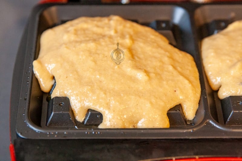Verhit je wafelijzer en vet deze goed in. Daarna vul je elke wafelvorm voor de helft met beslag.