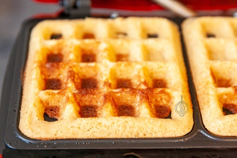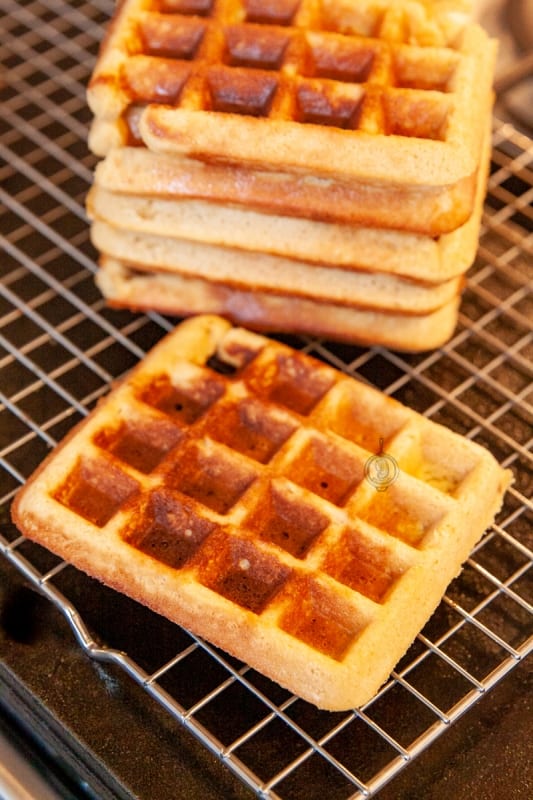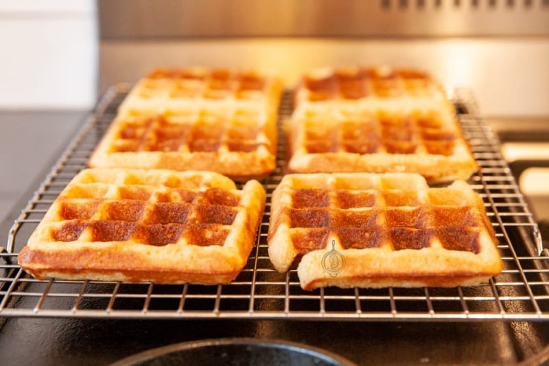 Laat de chaffles afkoelen op een afkoelrek. Ze harden nu uit.