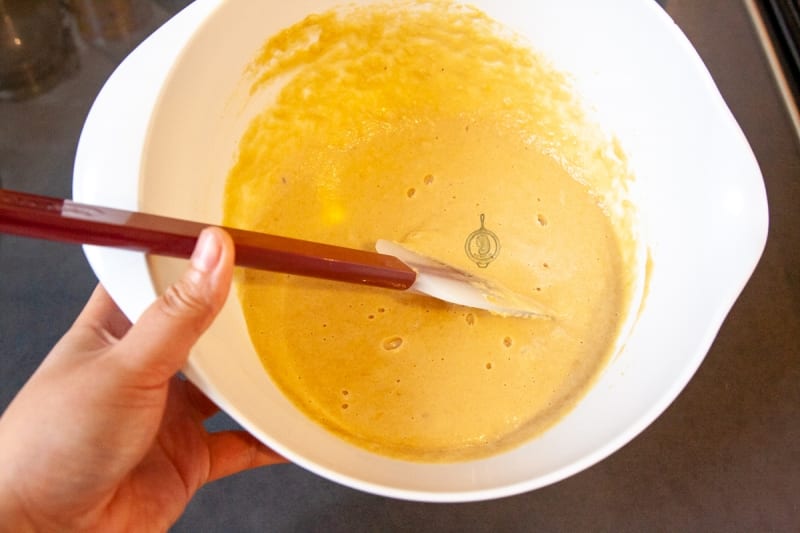 Neem een kleine mengkom. Roer hier in alle ingrediënten tot een dik en glad beslag.