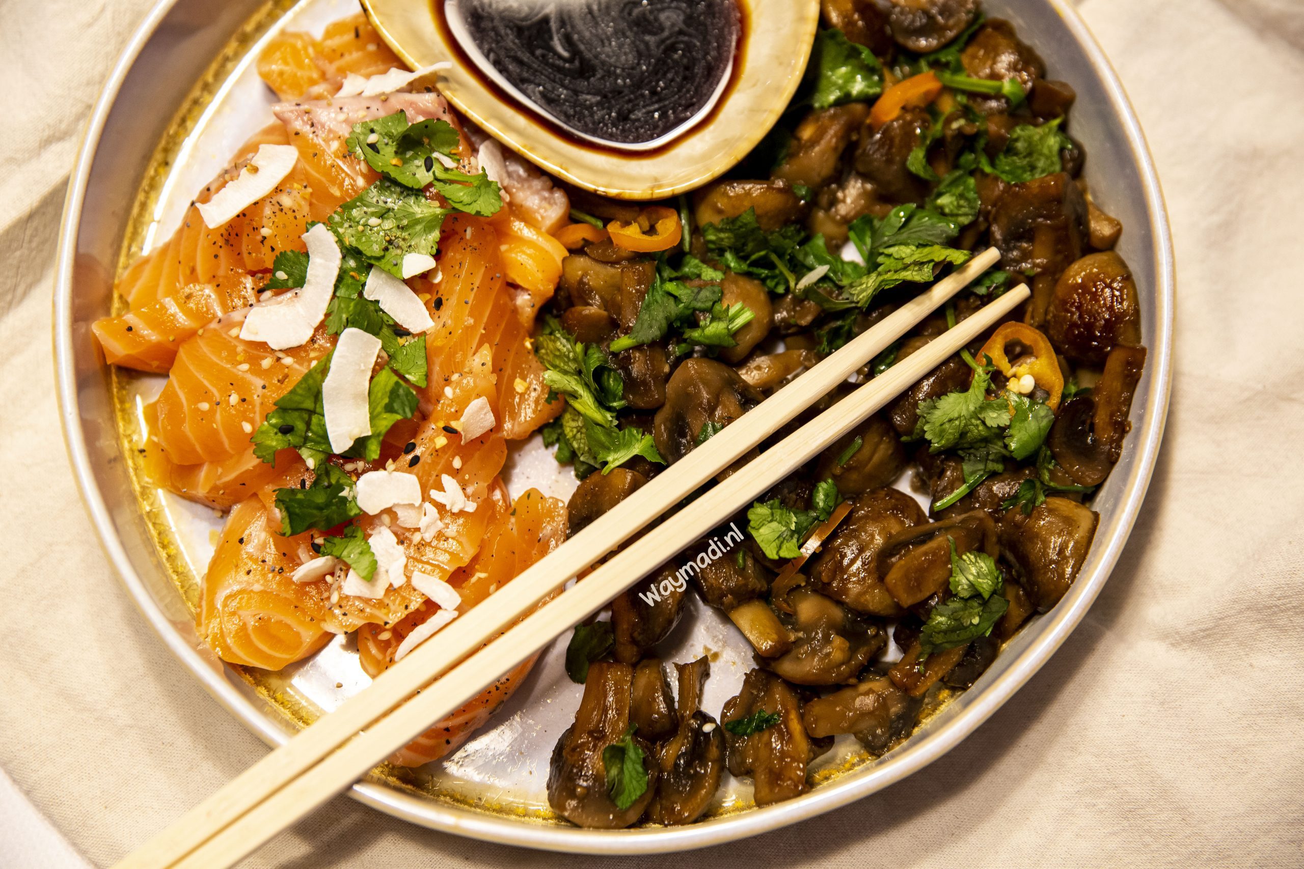 Vroeger maakte ik vaak gerechten met ketjap, zowel voor de smaak als het sticky effect. De koolhydraatarme ketjap versie is niet super sticky maar geeft wel een lekker sausje. Heerlijk met vis of vlees. Ik ben echt gek op sashimi en hou ervan om die met allerlei groenten te combineren. Hou je niet van sashimi dan kun je ook kiezen voor gebakken zalm of een andere vissoort.