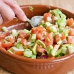 Begin met het snijden van de tomaat, komkommer en rode ui. Alles moet ongeveer in gelijke blokjes gesneden worden. Soms schillen we de komkommer voor een verfijndere smaak.