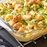 Voila! Laat de bloemkool ovenschotel een klein beetje afkoelen en strooi de fijngehakte verse koriander of peterselie er overheen. De bovenkant is een beetje krokant. Onder het krokante laagje vindt je de lekkere saus met aardappelen, kip en bloemkool.