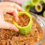 Tijd om te vullen. Je laat 1 cm aan de bovenste rand vrij. Tijdens het koken zet de vulling uit. Zachtjes aandrukken, maar niet te hard, anders kun je de courgette breken of breekt hij in de pan.