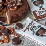 Terwijl de cheesecake in de oven staat maak je de pecan crunch. Smelt de Hands Off chocolade. Hak de pecannoten in stukjes en leg ze op een stuk bakpapier. Schenk de gesmolten chocola voorzichtig over de stukjes pecan. Als je de pecan crunch even in de koelkast zet is de chocolade zo weer gestold. Ook heel lekker om zo los te eten maar in dit recept gebruik ik het als topping voor de cheesecake.