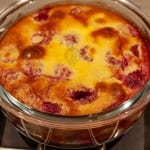 Nu mag de frambozen clafoutis de oven in voor 35 minuten of tot hij goudbruin is. De binnenkant mag een beetje zacht blijven.