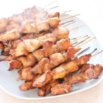 Na het marineren rijg je per stokje 4-5 stukken gemarineerde kip op de saté stokjes.